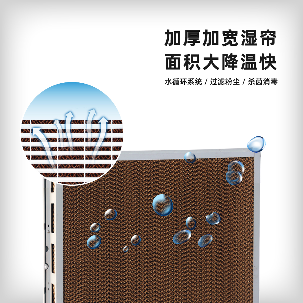 大面積濕簾 降溫快利用沉浸濕冰水的濕簾,使熱空氣通過(guò)后變成,冷空氣吹出提升降溫效果,達(dá)到清涼爽風(fēng)效果。 |
